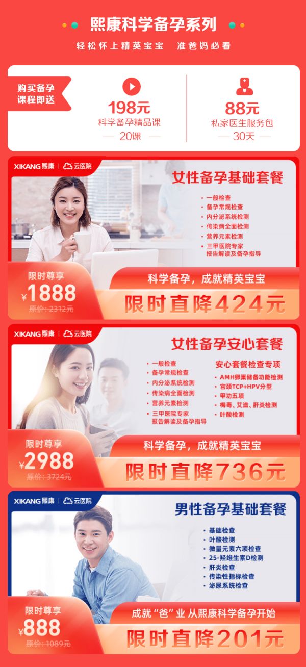 為了解決孕媽寶爸的備孕問題,熙心助孕聯(lián)手三甲醫(yī)院專家,推出了熙康科學備孕系列?,F(xiàn)有女性備孕基礎套餐、女性備孕安心套餐、男性備孕基礎套餐,最高直降736元,您將享受到全面的備孕檢查。
