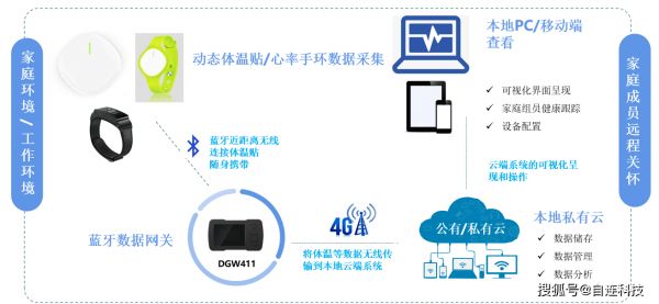 自連動態(tài)體溫/心率監(jiān)測解決方案通過可隨身佩戴的體溫貼和心率手環(huán)實時獲取連續(xù)的體溫和心率數(shù)據(jù),再通過自連藍牙數(shù)據(jù)網(wǎng)關(guān)實現(xiàn)藍牙與4G的轉(zhuǎn)換,將數(shù)據(jù)以4G形式上傳至云端,用戶可在系統(tǒng)后臺查看健康數(shù)據(jù)和分析,進行持續(xù)的健康跟蹤。
