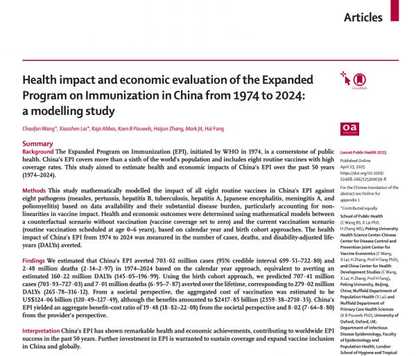 在2025年4月25日第39個(gè)“全國(guó)兒童預(yù)防接種日”到來(lái)之際,北京大學(xué)中國(guó)衛(wèi)生發(fā)展研究中心方海教授團(tuán)隊(duì)在Lancet Public Health(IF="25.4)發(fā)表題為《1974-2024年中國(guó)擴(kuò)大免疫規(guī)劃的健康影響與經(jīng)濟(jì)學(xué)評(píng)價(jià):一項(xiàng)模型研究》的重要成果,首次量化了中國(guó)擴(kuò)大免疫規(guī)劃在50年間避免的疾病負(fù)擔(dān)與經(jīng)濟(jì)效益,為全球擴(kuò)大免疫規(guī)劃實(shí)施提供了關(guān)鍵證據(jù)。