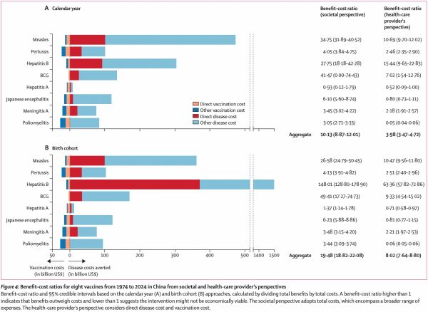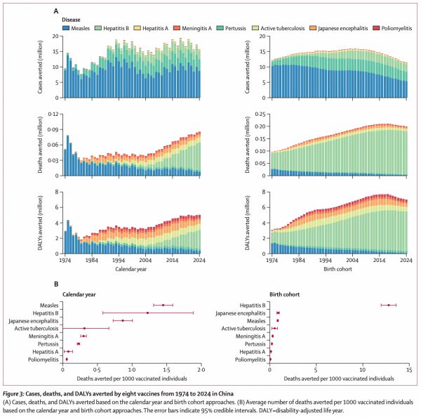 研究基于數(shù)學(xué)模型,結(jié)合歷史數(shù)據(jù)與反事實(shí)分析,評(píng)估了1974-2024年中國(guó)擴(kuò)大免疫規(guī)劃中針對(duì)8種病原體(麻疹、百日咳、乙肝、結(jié)核病、甲肝、日本腦炎、A群腦膜炎和脊髓灰質(zhì)炎)疫苗接種的健康效果與經(jīng)濟(jì)價(jià)值。結(jié)果顯示,1974-2024年,基于日歷年(Calendar Year)分析,8種主要疫苗累計(jì)預(yù)防了7.03億例病例、248萬(wàn)例死亡,相當(dāng)于避免了1.60億傷殘調(diào)整生命年。兒童疫苗接種的長(zhǎng)期健康收益及群體免疫效應(yīng)也在持續(xù)釋放,基于出生隊(duì)列(BirthCohort)分析,在1974-2024年50個(gè)出生隊(duì)列的個(gè)體生命周期內(nèi)共預(yù)防7.07億例病例、701萬(wàn)例死亡,相當(dāng)于避免了2.79億傷殘調(diào)整生命年,顯示了兒童疫苗接種對(duì)成年期健康的長(zhǎng)遠(yuǎn)保護(hù)。