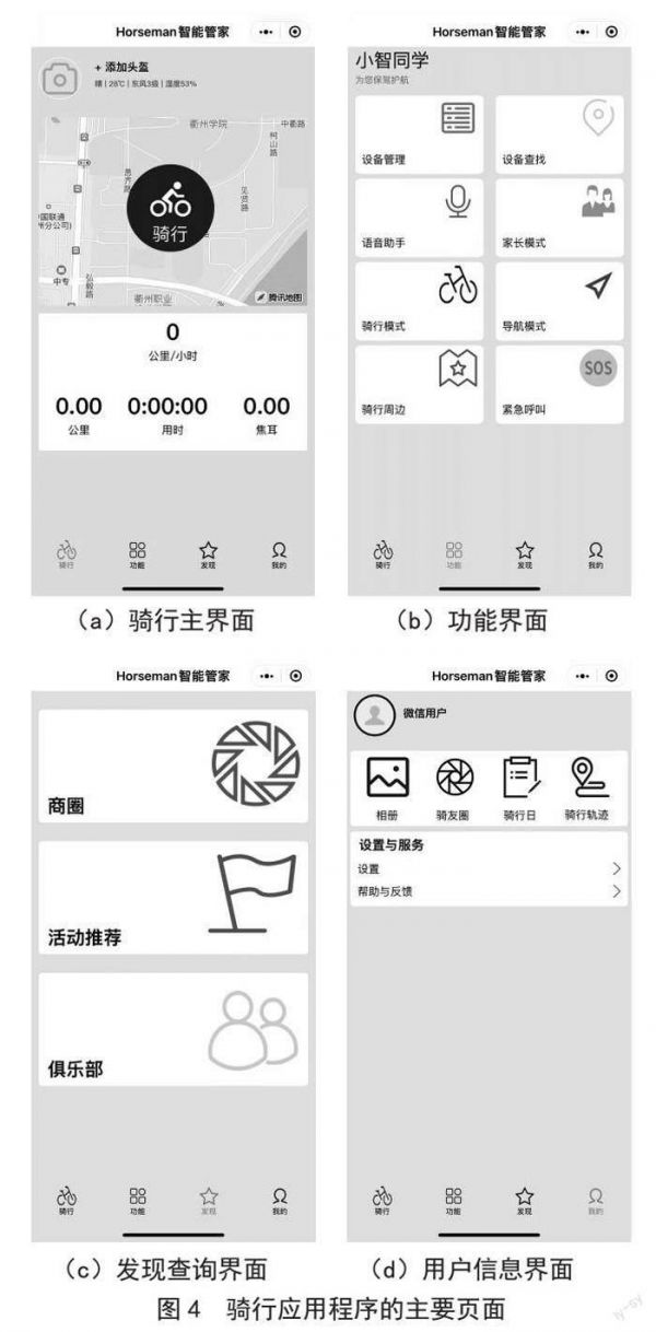 該騎行APP提供騎行、功能、發(fā)現(xiàn)和我的四個主要導航功能,如圖4所示。