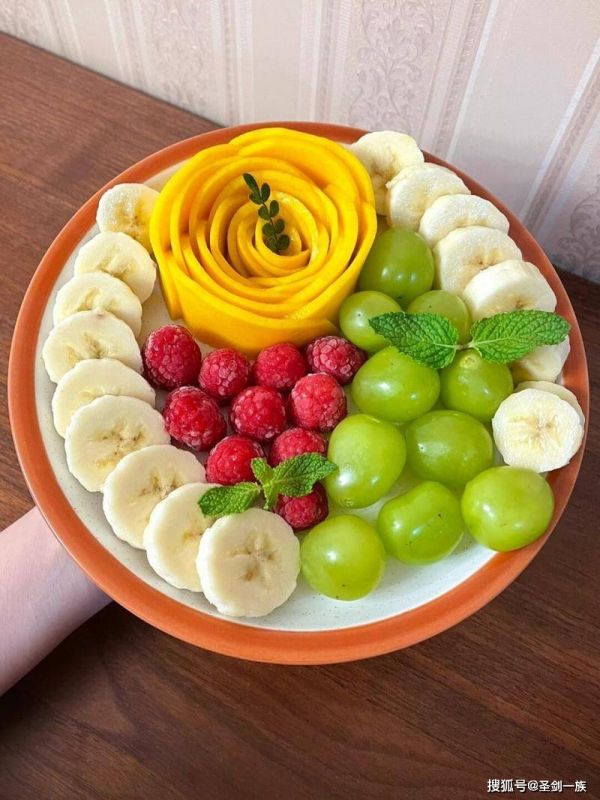 2. 將水果擺放在盤子中,拼成自己喜歡的形狀即可。