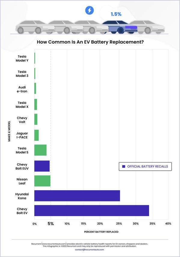 據IT之家了解,Recurrent Auto 的調查涵蓋了 13 種車型,包括特斯拉 Model S、Model 3 和 Model Y;雪佛蘭 Bolt、Bolt EUV 和 Volt;現代 Kona;寶馬 i3;奧迪 e-tron;日產聆風;現代 Kona 和 IONIQ 5;以及福特野馬 Mach-E。