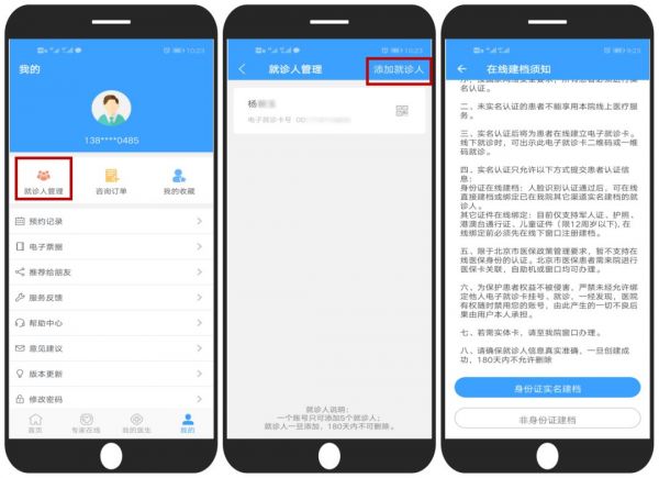 已實名認證患者可在“我的”→“就診人管理”查看已獲取電子就醫(yī)卡信息。 新患者可在“我的”→“就診人管理”→“添加就診人”在線填寫注冊信息,驗證通過后可成功辦理電子就醫(yī)卡。線上APP同時支持在線咨詢和在線掛號,足不出戶與專家進行一對一咨詢問診,解決外地患者就醫(yī)跑路等難題。