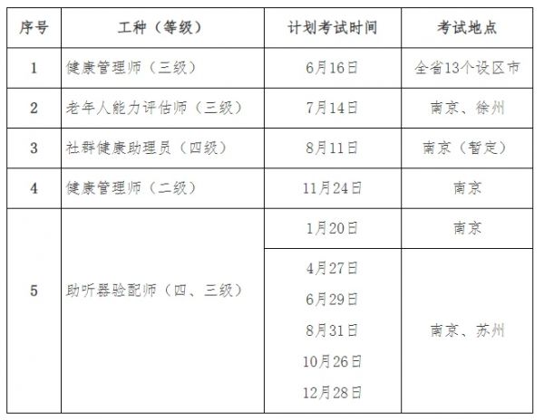 根據(jù)省職業(yè)技能鑒定中心有關(guān)工作要求,擬于2024年度開展健康管理師(三級、二級)、老年人能力評估師(三級)、社群健康助理員(四級)和助聽器驗配師(四級、三級)職業(yè)技能認(rèn)定考試?,F(xiàn)將2024年度職業(yè)技能等級認(rèn)定考試的全年計劃公告如下: