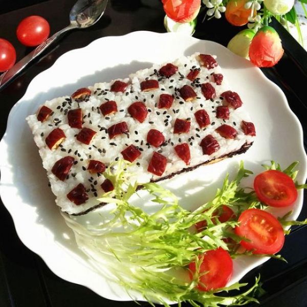 第8步、再鋪上一層糯米,最后鋪上一層紅棗丁,壓實撒上熟黑芝麻即可,沒有也可以不撒,將定型好的糯米糕從容器中取出。