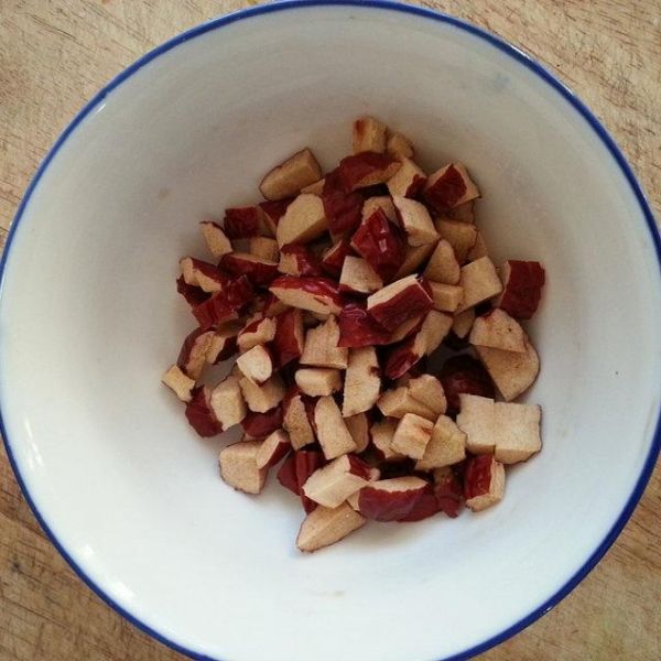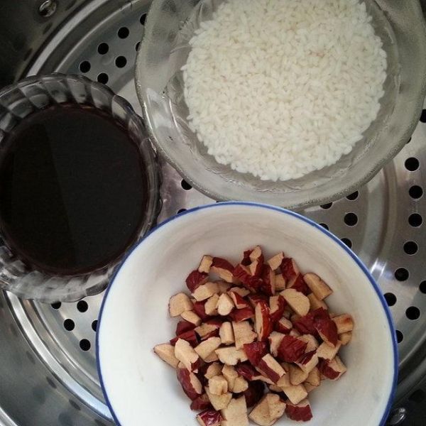第4步、糯米、黑米中加適量的水,紅棗丁也裝小碗中,用蒸鍋蒸20分鐘。