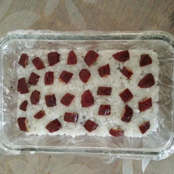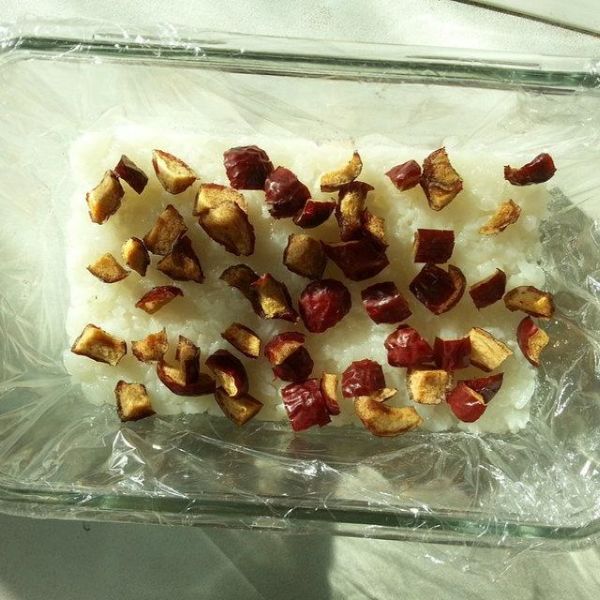 第6步、用一個合適的容器,鋪上保鮮膜或抹上一層食用油,用勺子沾上涼開水,舀適量的糯米鋪在容器的底部并壓平,再鋪上一層紅棗丁。