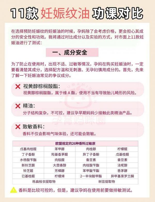 為了防止在使用時,出現(xiàn)不適、過敏等情況,孕媽在購買妊娠油時,一定要看清楚其成分,選擇配方溫和無刺激、無孕婦慎用成分的。首先,先來了解一下妊娠油常見的爭議成分。