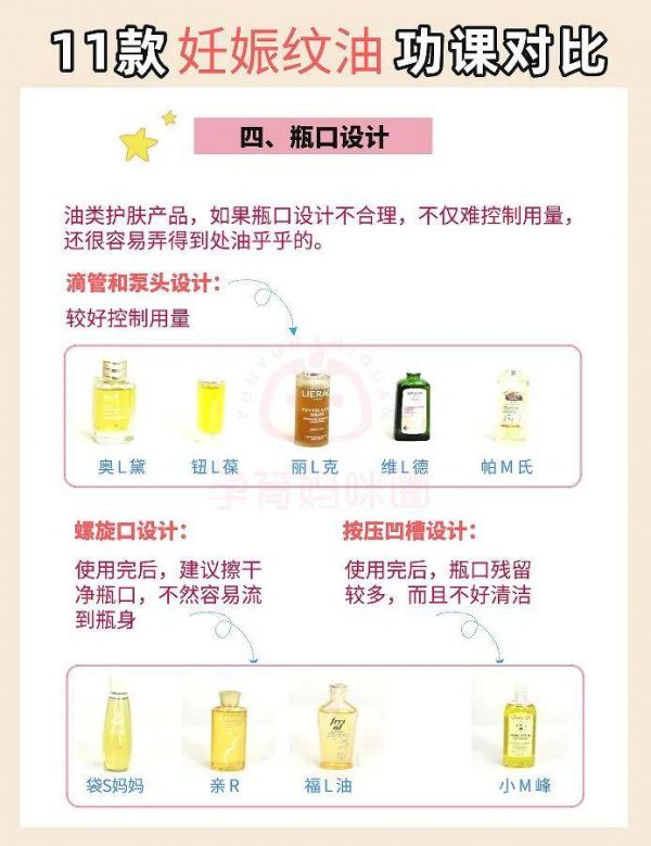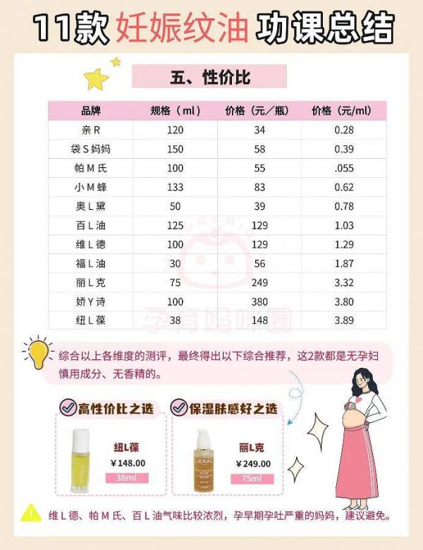 在選擇預(yù)防妊娠紋的妊娠油的時候,孕媽除了會考慮價格,更會擔(dān)心其成分的安全性和功效。下面,小編對市面上11款妊娠油進行了對比: