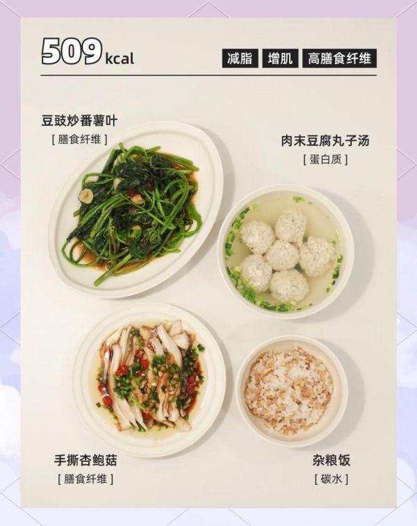 晚餐選擇雜糧飯為主食,搭配肉末丸子和老豆腐補充蛋白質(zhì),以炒番薯葉和手撕杏鮑菇提供豐富的膳食纖維。