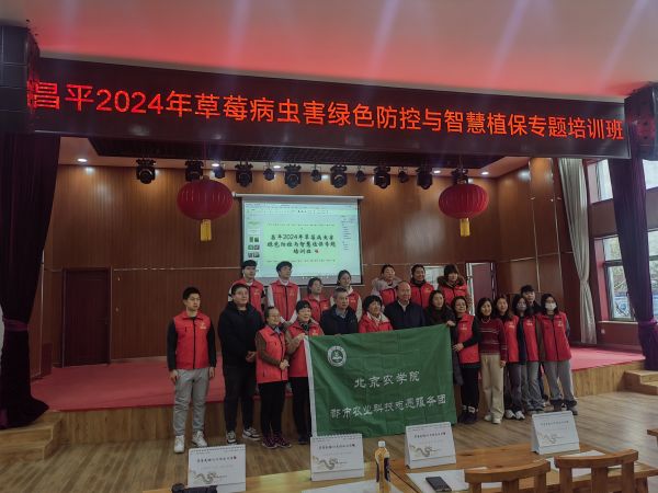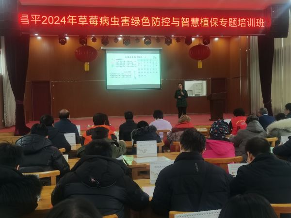2024年1月19日,北京農(nóng)學(xué)院都市農(nóng)業(yè)科技志愿服務(wù)團(tuán)在學(xué)校植物健康研究院院長(zhǎng)尚巧霞教授帶領(lǐng)下,聯(lián)合昌平區(qū)農(nóng)業(yè)技術(shù)推廣站,前往興壽鎮(zhèn)辛莊村,面向周邊草莓種植戶開(kāi)展培訓(xùn)。此次培訓(xùn),以草莓病蟲(chóng)害綠色防控與智慧植保為主題,共有70余名草莓種植戶參加。