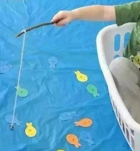 彩紙剪成小魚形狀,回形針別在小魚上,木棍和繩子做成“魚竿”,磁鐵做“魚餌”,用磁鐵吸住小魚身上的回形針??梢栽黾与y度,讓孩子找出相應(yīng)的顏色和數(shù)量。