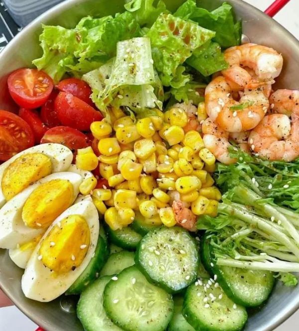 食材:蝦仁、雞蛋、小黃瓜、小番茄、苦苣、生菜、玉米粒