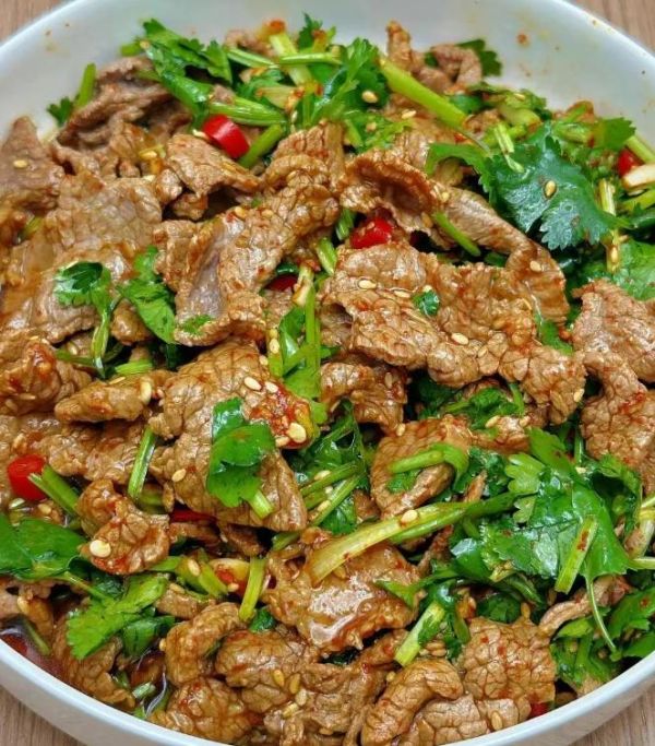 把牛肉放進(jìn)沸水里煮 2 分鐘,撈出來,淋上醬料攪拌均勻就能吃啦。