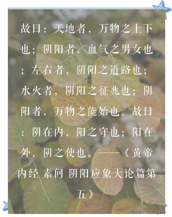 故曰:天地者,萬(wàn)物之上下也;陰陽(yáng)者,血?dú)庵信玻蛔笥艺?,陰?yáng)之道路也;水火者,陰陽(yáng)之征兆也;陰陽(yáng)者,萬(wàn)物之能始也。故曰:陰在內(nèi),陽(yáng)之守也;陽(yáng)在外,陰之使也?!饵S帝內(nèi)經(jīng) 素問(wèn) 陰陽(yáng)應(yīng)象大論篇第五》