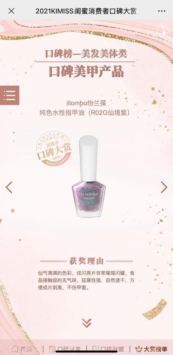 怡蘭葆水性指彩系列以無(wú)明顯氣味、免烤快干、撕拉可卸為功能點(diǎn)。產(chǎn)品已獲得廣東檢驗(yàn)檢疫技術(shù)中心(IQTC檢測(cè))、MGSL檢測(cè)、SGS認(rèn)證、國(guó)家化妝品檢測(cè)等檢測(cè)報(bào)告,不含任何有害人體健康的重金屬物質(zhì),安全親膚。illombo怡蘭葆品牌指甲油產(chǎn)品擁有多色系繽紛搭配,兼顧美學(xué)藝術(shù)與健康安全,不僅獲得了2020年ELLE綠色美力之星——健康安全指彩獎(jiǎng),2021年ELLE綠色美力之星——安全美甲口碑獎(jiǎng),2021年KIMISS——年度口碑美甲產(chǎn)品,并在2023年獲得了C2CC新傳媒——2023年度新妝大賞鮮鋒品牌獎(jiǎng)。