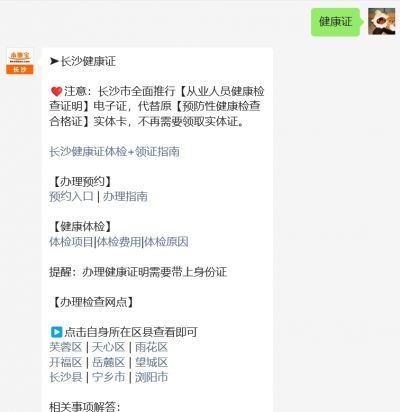 溫馨提示:微信搜索公眾號【長沙本地寶】,關注后在對話框回復【健康證】可獲長沙健康證辦理地點及領證入口,查看各區(qū)縣各個醫(yī)院健康證辦理指南,包含時間、項目、電話等信息。