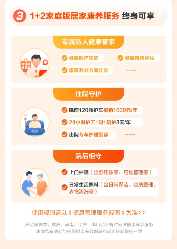 院中護理——住院期間,每人每年可享3天專業(yè)護工陪護、康護管家住院探訪。