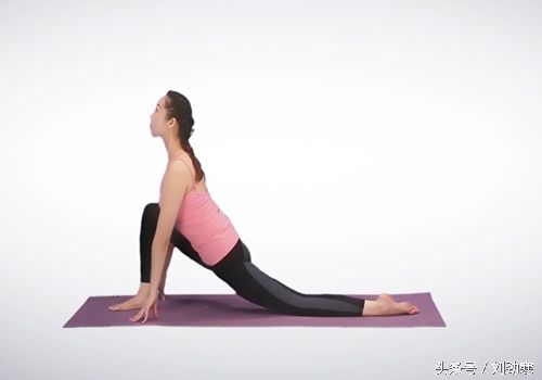 第四,吸氣,屈左膝,右腿緩慢向后伸,右膝放在地面上,眼睛朝上看,身體伸展,伸直背部。