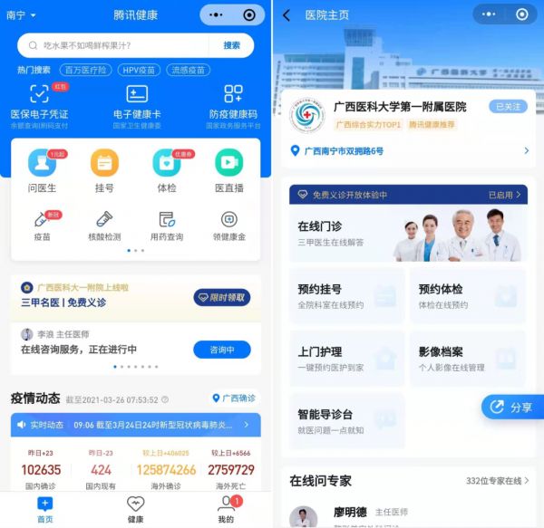 新冠肺炎疫情讓“互聯(lián)網(wǎng)+醫(yī)療健康”駛上了快車道。2020年12月,國家衛(wèi)生健康委聯(lián)合國家醫(yī)療保障局、國家中醫(yī)藥管理局發(fā)布《關(guān)于深入推進“互聯(lián)網(wǎng)+醫(yī)療健康”“五個一”服務(wù)行動的通知》,要求加快推進線上線下一體化的醫(yī)療服務(wù)模式,推動便民惠民醫(yī)療服務(wù)向縱深發(fā)展。去年疫情改變了人們的就醫(yī)方式,廣西醫(yī)科大學(xué)第一附屬醫(yī)院(以下簡稱廣西醫(yī)科大一附院)也在疫情期間迅速推出了在線問診服務(wù),為患者和醫(yī)生打開了一扇交流的窗口,并在隨后進一步通過騰訊健康服務(wù)平臺,建設(shè)起了完整的互聯(lián)網(wǎng)醫(yī)院,整合了診療全流程的各種場景,為患者提供線上線下一體化的服務(wù)。