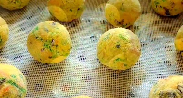 將搓好的小圓球狀食材,逐個放入盤中,稍微留些間隔,以免粘連。