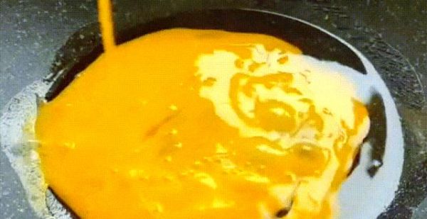 隨后,在熱鍋中加入少許食用油,待油溫適中時,將雞蛋液緩緩倒入鍋中,進(jìn)行煸炒,直至炒成大小適中的塊狀物。