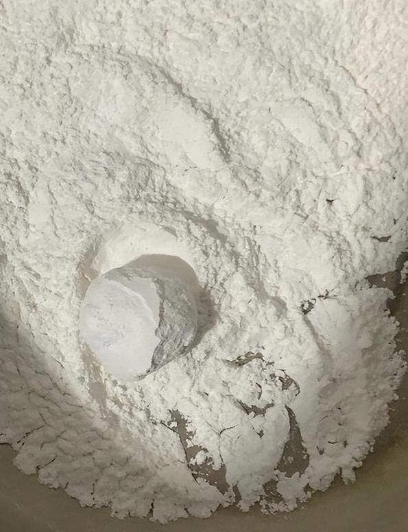 5.混合食材和糯米粉:將炒好的糯米粉和破壁機打成的食材粉混合在一個大的盆中,佩戴手套用手將它們均勻混合?;旌虾蟮臓顟B(tài)應該是灰白色,食材放在手里握緊可以成團,輕輕一捏就能散開。