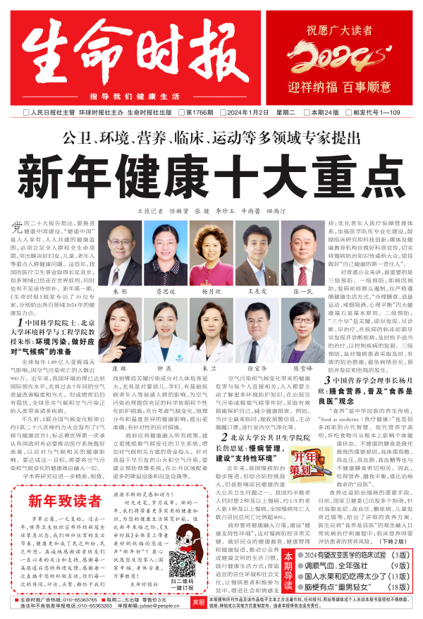 黨的二十大報告指出,要推進(jìn)健康中國建設(shè)?!敖】抵袊笔侨巳讼碛?、人人共建的健康藍(lán)圖,必須立足全人群和全生命周期,突出解決好婦女、兒童、老年人等重點人群健康問題。這些年,我國的醫(yī)療衛(wèi)生事業(yè)取得長足進(jìn)步,很多領(lǐng)域已經(jīng)走在世界前列,同時也有不足亟待彌補。新年第一期,《生命時報》獨家專訪了10位專家,分別給出各自領(lǐng)域2024年的健康發(fā)力點。其中,中國科學(xué)院院士、北京大學(xué)環(huán)境科學(xué)與工程學(xué)院教授、CCAPP指導(dǎo)委員會委員朱彤呼吁關(guān)注環(huán)境污染及氣候變化的健康影響。