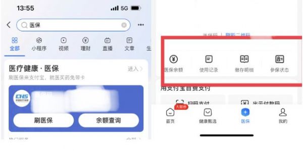 5.支付寶查詢:搜索“醫(yī)保”,進入個人醫(yī)保電子賬戶,查醫(yī)保余額、使用記錄、繳存明細和參保狀態(tài)。