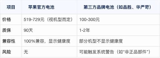 條件:iPhone保修期為1年,AppleCare+用戶可延長(zhǎng)至2年。政策:保修期內(nèi)電池健康度低于80%,可免費(fèi)更換。案例:用戶iPhone 14購(gòu)買11個(gè)月后健康度降至79%,成功免費(fèi)換電池。2. 過(guò)保后:第三方電池VS官方電池
