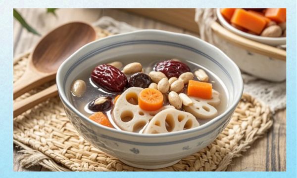 藕1節(jié),胡蘿卜1根,香菇若干,花生適量,紅棗數(shù)顆,姜片3-4片,鹽適量。