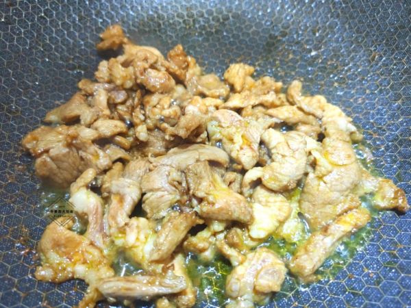 3、鍋中加入適量食用油,油溫4成熱時,放入腌制好的肉片,煸炒2分鐘,至肉片斷生。