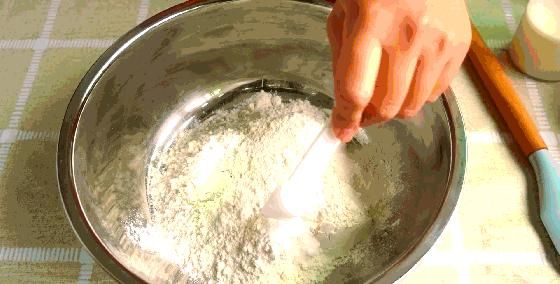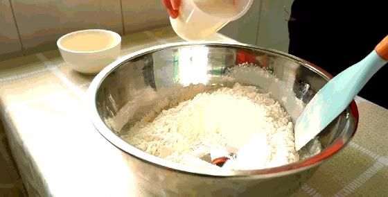 在面粉中央挖出一個凹陷,接著將140克純牛奶和30克雞蛋清依次加入其中。隨后,使用硅膠鏟將濕料與干料充分?jǐn)嚢杈鶆颍敝吝_(dá)到所需的面團質(zhì)地。