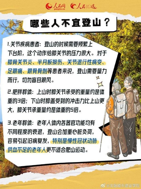? 老年人:隨著年齡的增長,身體機能下降,關(guān)節(jié)和骨骼更加脆弱,容易發(fā)生意外。老年人在進行爬山登梯運動時,要選擇難度較低的路線,控制運動強度和時間,最好有家人陪同。