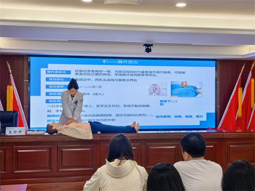 王雪迪利用心肺復(fù)蘇教學(xué)模型,進(jìn)行了生動(dòng)直觀的現(xiàn)場(chǎng)心肺復(fù)蘇演示。多名職工踴躍上臺(tái),親身體驗(yàn)了胸外按壓和模擬AED操作的全過程。這種“手把手”的教學(xué)方式極大地提升了培訓(xùn)效果,讓職工們真正掌握了這項(xiàng)關(guān)鍵時(shí)刻“能救命”的技能。