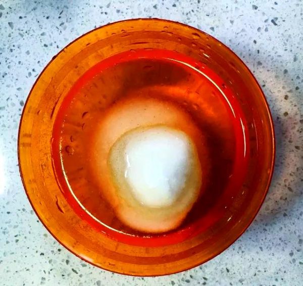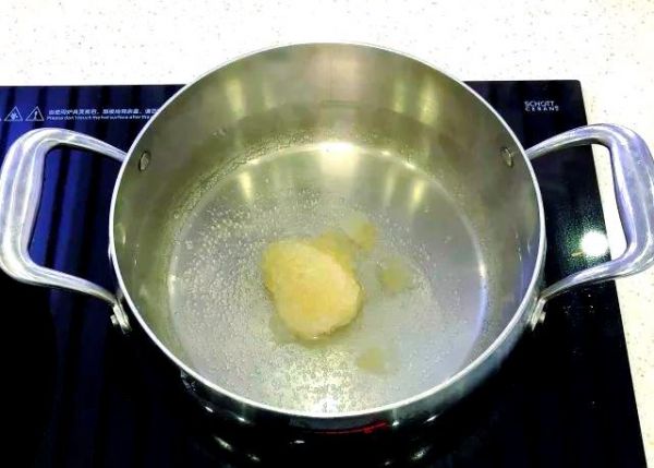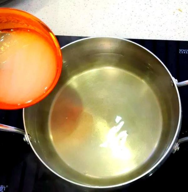 冰糖完全溶解后,將火力調(diào)整至900瓦,隨后緩緩倒入預(yù)先調(diào)制好的白涼粉水。