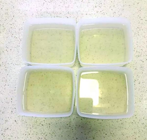 將果凍水倒入密封容器中,放入冰箱進(jìn)行冷卻。