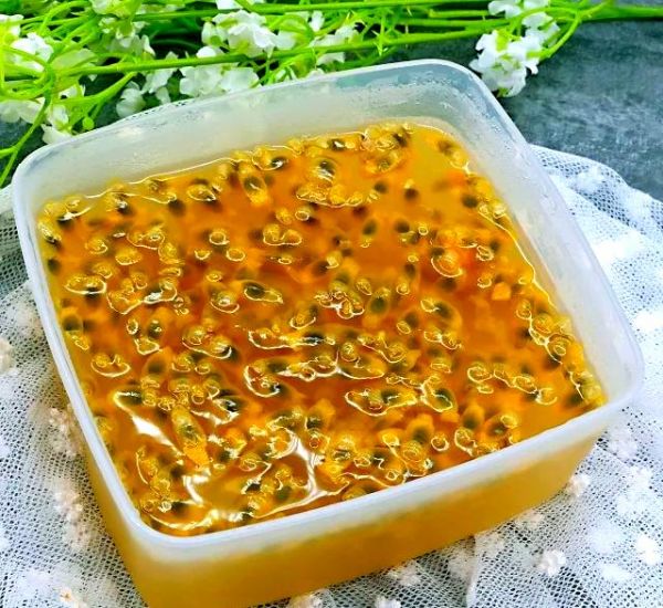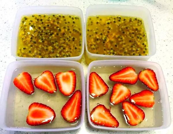 將四個(gè)百香果的果肉挖出,與250克新鮮草莓一同放入涼粉液中,輕輕攪拌均勻。