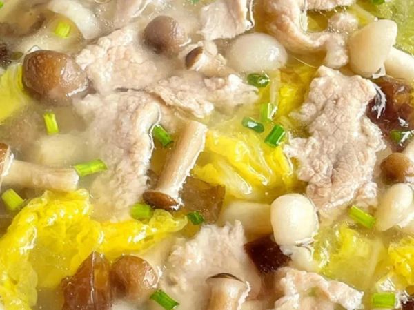 放入瘦肉:放入腌制好的瘦肉片,煮至瘦肉變色熟透,根據(jù)個(gè)人口味加入適量鹽調(diào)味,攪拌均勻,撒上蔥花。這道湯味道鮮美,娃娃菜的清甜、蟹味菇的鮮香與瘦肉的嫩滑完美融合,能有效潤腸解膩,促進(jìn)消化吸收。