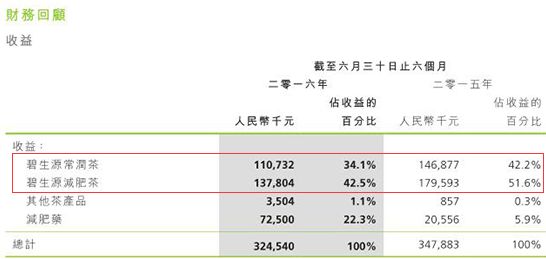 碧生源兩款産品上半年?duì)I收情況 圖片來源:碧生源2016年半年報(bào)
