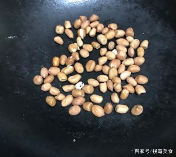 5.這是炒了大約二十多分鐘的樣子,炒成這個(gè)顏色就可以了,然后冷鍋冷油,少油,倒入生花生米,小火酥炸幾分鐘,鏟子不停翻炒,這里的花生米是完整的放在油茶上面的。