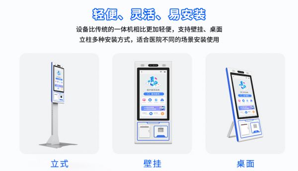 醫(yī)療自助服務一體機比傳統(tǒng)的一體機相比更加輕便,支持壁掛、桌面、立柱多種安裝方式,適合醫(yī)院不同的場景安裝使用。