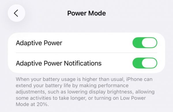 此次更新還在“設置 > 電池 > 電源模式”中增加了“自適應電源通知”選項。開啟后,系統(tǒng)會在 iPhone 自動優(yōu)化性能、延長續(xù)航時主動提醒用戶。例如,在電量降至 20% 后,系統(tǒng)會降低屏幕亮度或自動切換到低電量模式。