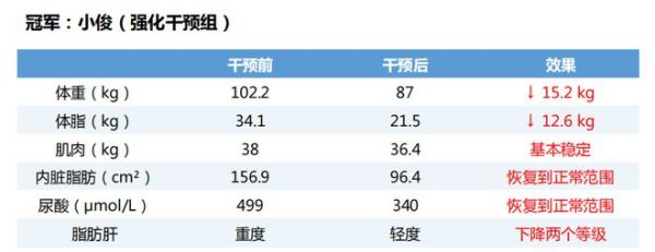 外有“名師多對一”,內(nèi)有決心、恒心、毅力,所有醫(yī)囑巨細(xì)靡遺、不折不扣完成,最終造就了小俊在賽道上的一騎絕塵,在減重與減脂兩項(xiàng)指標(biāo)上都拔得頭籌。從超過200斤大腹便便的模樣,到如今擁有麒麟臂的型男,小俊共減重30.4斤、減脂25.2斤,最終將體重穩(wěn)定在174斤,比賽結(jié)束后也未出現(xiàn)反彈。更讓他高興的是,內(nèi)臟脂肪、尿酸均降至正常水平,脂肪肝也由重度轉(zhuǎn)為輕度。