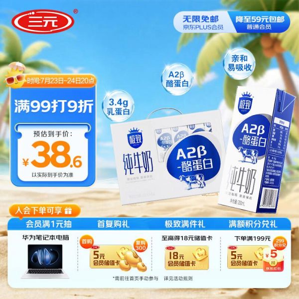 三元極致A2β-酪蛋白純牛奶 - 采用特殊奶源,僅含A2型β-酪蛋白,分子結(jié)構(gòu)更親和人體。每100ml含3.3g優(yōu)質(zhì)蛋白和110mg鈣,禮盒包裝適合送禮或家庭囤貨。200ml小包裝設(shè)計(jì),一次飲用剛剛好,避免浪費(fèi)。