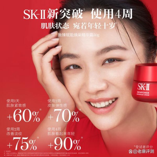 SK-II賦能煥采精華霜(50g)采用突破性的抗皺技術(shù),結(jié)合SK-II經(jīng)典成分PITERA,致力于改善肌膚衰老跡象,幫助肌膚恢復(fù)年輕光彩。通過減少衰老因子AT-O,產(chǎn)品有效激活肌膚的年輕源力,提升皮膚的緊致感、彈性與水潤度,顯著減淡干紋與細(xì)紋,令肌膚看起來更加年輕。