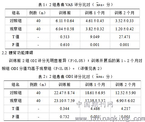 1992年P(guān)anjabi首次提出核心穩(wěn)定性這一概念,隨后在康復(fù)醫(yī)學(xué)領(lǐng)域盛行。核心穩(wěn)定性訓(xùn)練為一種感覺運動形式,主要針對核心肌群、深層小肌群開展訓(xùn)練,鍛煉穩(wěn)定性、平衡性及增強肌力[4]。與傳統(tǒng)康復(fù)訓(xùn)練相比,其優(yōu)勢在于其改善、提高了核心區(qū)的整體原動肌及局部穩(wěn)定肌。核心穩(wěn)定性訓(xùn)練常借助平衡墊、bobath 球等工具開展,訓(xùn)練過程中姿勢要正確,每個動作需鍛煉到軀干深部的肌肉,循序漸進逐漸提高肌肉群的閾值,建立核心區(qū)肌力的穩(wěn)定,從而維持身軀的穩(wěn)定[5]。從文中的數(shù)據(jù)可知,在訓(xùn)練開展的過程中相比對照組,觀察組的疼痛度逐漸減低且腰背功能障礙逐漸改善,差異具有顯著性(P<0.05)。