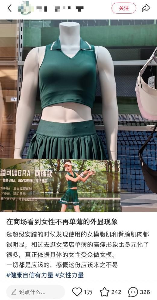 最近,一網(wǎng)友發(fā)布了一條小紅書,引起熱議。她發(fā)現(xiàn)安踏門店里的女模特能看到明顯的腹肌和手臂上的肌肉線條,和過去在女裝店里看到又高又瘦的單薄形象完全不一樣,打破了人們對“女模特”的固有想象。