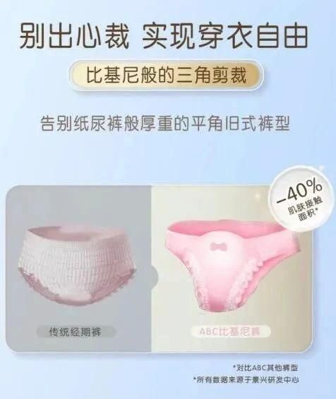 安睡褲作為女性生理期的剛需衛(wèi)生用品,核心價值從來都是安全防漏、貼身舒適、方便實用,但ABC的“比基尼安睡褲”卻打著“別出心裁 實現(xiàn)穿衣自由”的口號,把本應(yīng)寬松貼合的安睡褲,設(shè)計成類似比基尼的低腰窄襠款式,還打出一個“經(jīng)期性感”的slogan,精準(zhǔn)踩中了女性消費(fèi)者的雷區(qū),引發(fā)集體吐槽。